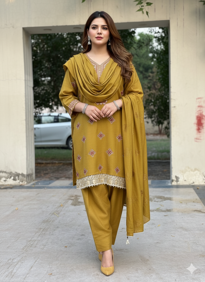 A perfect blend of grace and charm — this Olive Green 3-piece stitched embroidered suit is designed to bring elegance to your wardrobe. The shirt features delicate embroidery motifs on the front, neckline, and sleeves, beautifully enhanced with lace detailing for a refined finish.